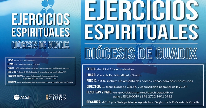 La delegación de Apostolado Seglar de la diócesis de Guadix organiza una tanda de Ejercicios Espirituales para Seglares, en colaboración con la Asociación Católica de Propagandistas (ACdP). Serán del viernes 19 al domingo 21 de noviembre, en el Centro Diocesano de Espiritualidad, de Guadix. Los Ejercicios comenzarán a primeras horas de la tarde del viernes 19 de octubre y terminarán en la tarde del domingo. Estarán dirigidos por el sacerdote Jesús Robledo García, viceconsiliario de la ACdP.
