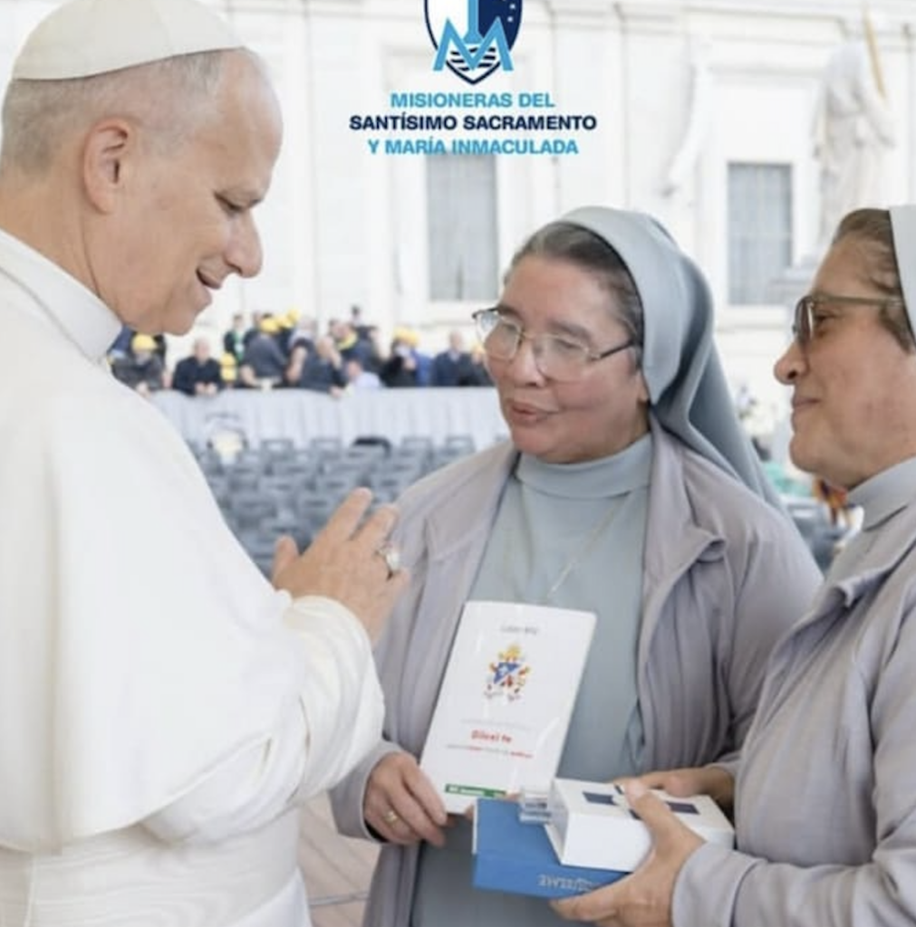 El pasado 25 de octubre, la hermana Marian Macías Rodríguez, Superiora General de las Misioneras del Santísimo Sacramento de la Inmaculada, y la hermana Marta Cecilia Bedoya Rúa, estuvieron en Roma, participando en la audiencia jubilar en la Plaza de San Pedro, donde tuvieron ocasión de encontrarse con el Papa León XIV. En esos días, del 24 al 26 de octubre, se celebró el Jubileo de los equipos sinodales y los organismos de participación en el Sínodo sobre la sinodalidad.