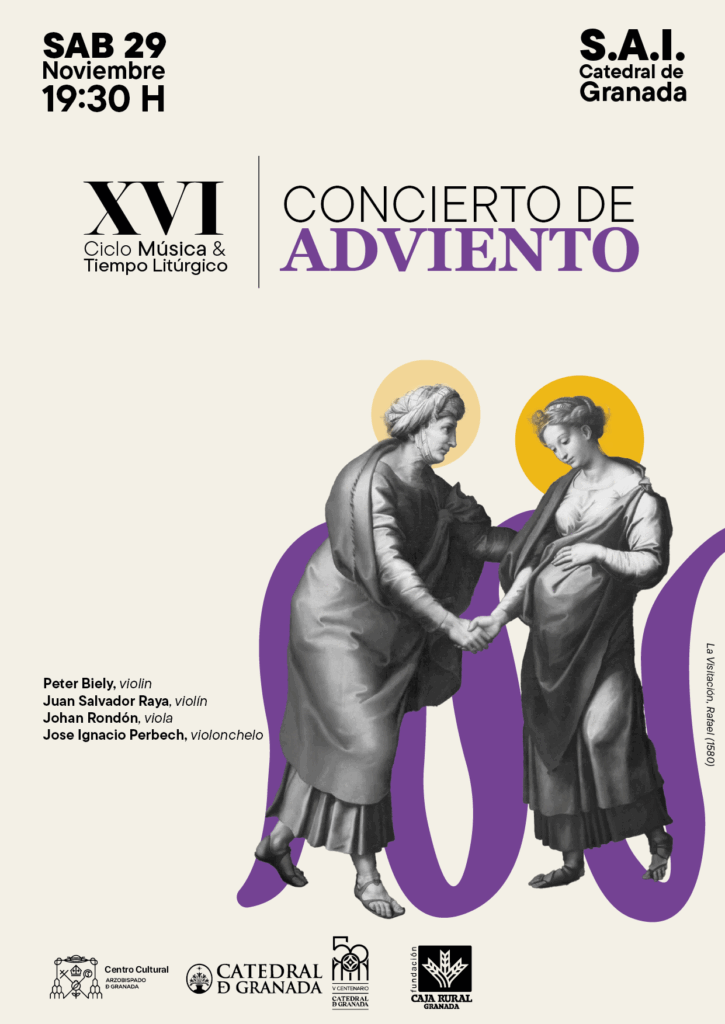 El concierto de Adviento, dentro del Ciclo de Música y Tiempo Litúrgico, será el sábado día 29, a las 19:30 horas, con acceso libre, en la Catedral. Patrocinado por la Fundación Caja Rural de Granada, estará a cargo de Peter Biely y Juan Salvador Raya, ambos en el violín; Johan Rondón, en la viola; y José Ignacio Perbech, en el violonchelo.