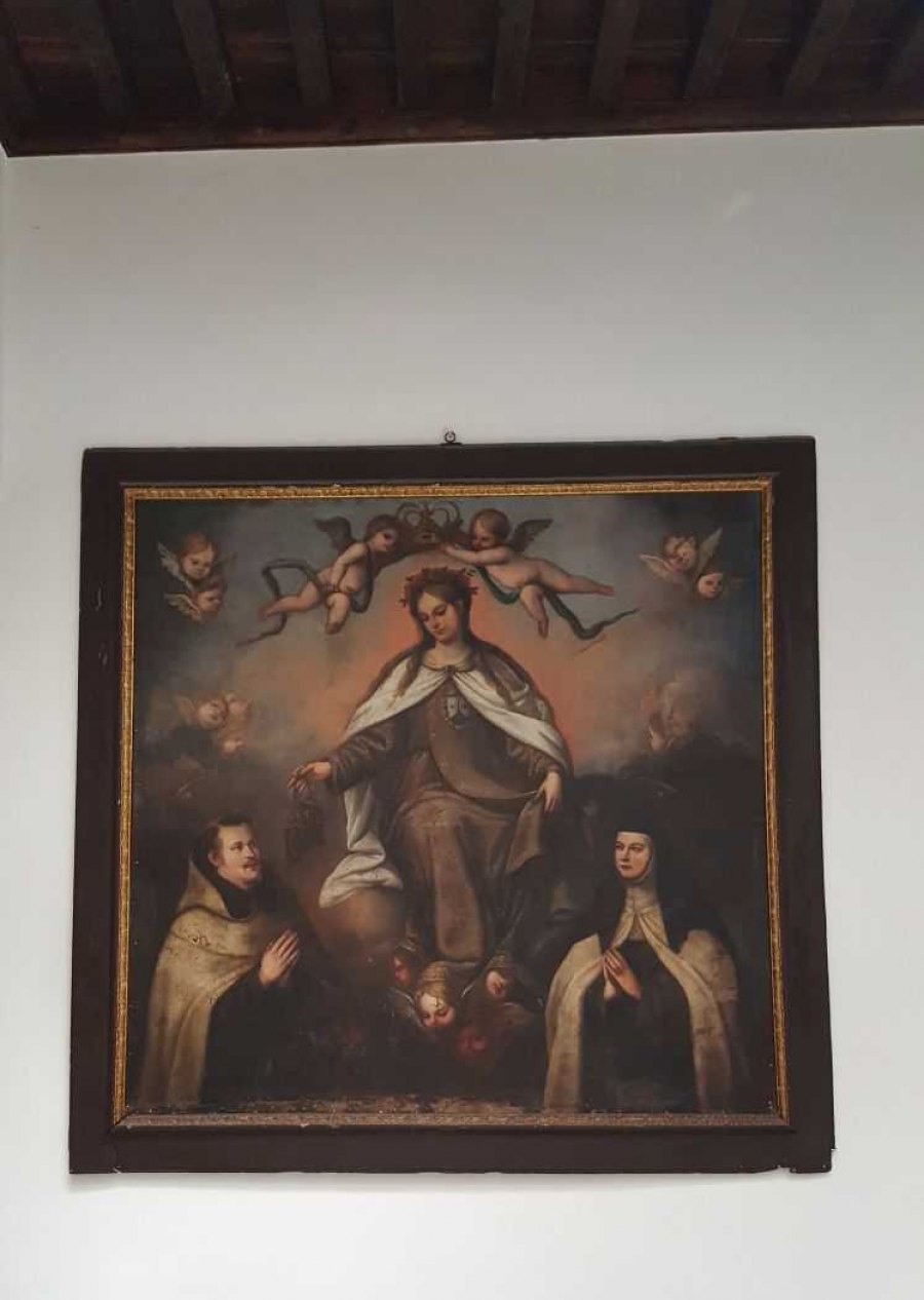 El escapulario carmelita es una prenda situada en la parte central del hábito originario del siglo XIII, una época de fuertes desafíos para la Orden en la que el Superior General, el fraile inglés San Simón Stock, suplicó con insistencia la ayuda de la Santísima Virgen que en 1251, acompañada de una multitud de ángeles, se apareció a San Simón con el escapulario de la Orden en sus manos, y le dijo: “Tú y todos los Carmelitas tendréis el privilegio, que quien muera con él no padecerá el fuego eterno”; es decir, quien muera con él, se salvará”.