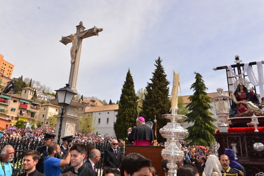El pueblo cristiano de Granada se reunió el Viernes Santo a las 3 de la tarde en el Campo del Príncipe para rezar ante el Cristo de los Favores junto a la Cofradía del Señor de la Humildad, Soledad de Nuestra Señora y Dulce Nombre de Jesús, que trasladó, como cada año, la imagen de la Virgen hasta el lugar.