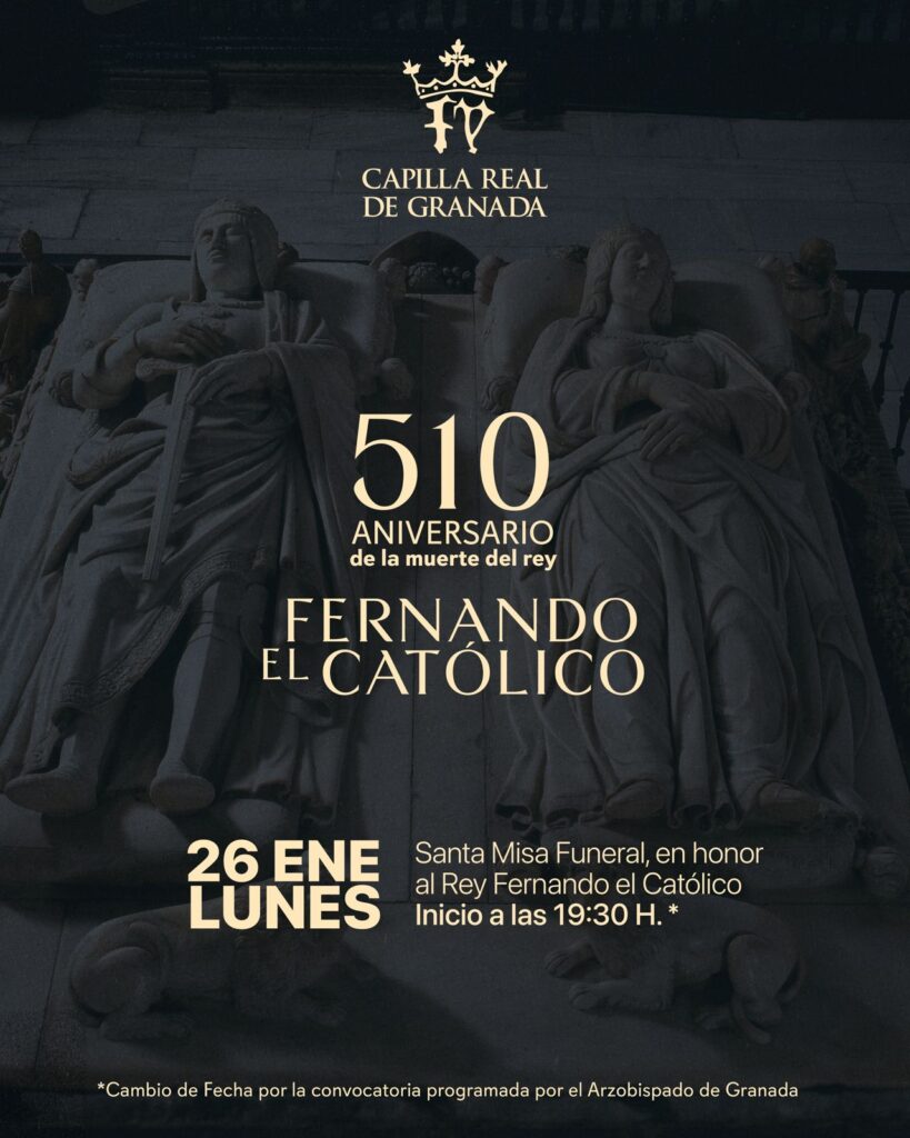 Con motivo de la coincidencia en el día y hora con la misa funeral convocada por la Archidiócesis para rezar por las víctimas del accidente ferroviario en Adamuz (Córdoba) en la Catedral, la misa convocada por el Cabildo de la Capilla Real en conmemoración del 510 aniversario del fallecimiento del Rey Fernando el Católico se traslada al lunes 26 de enero.